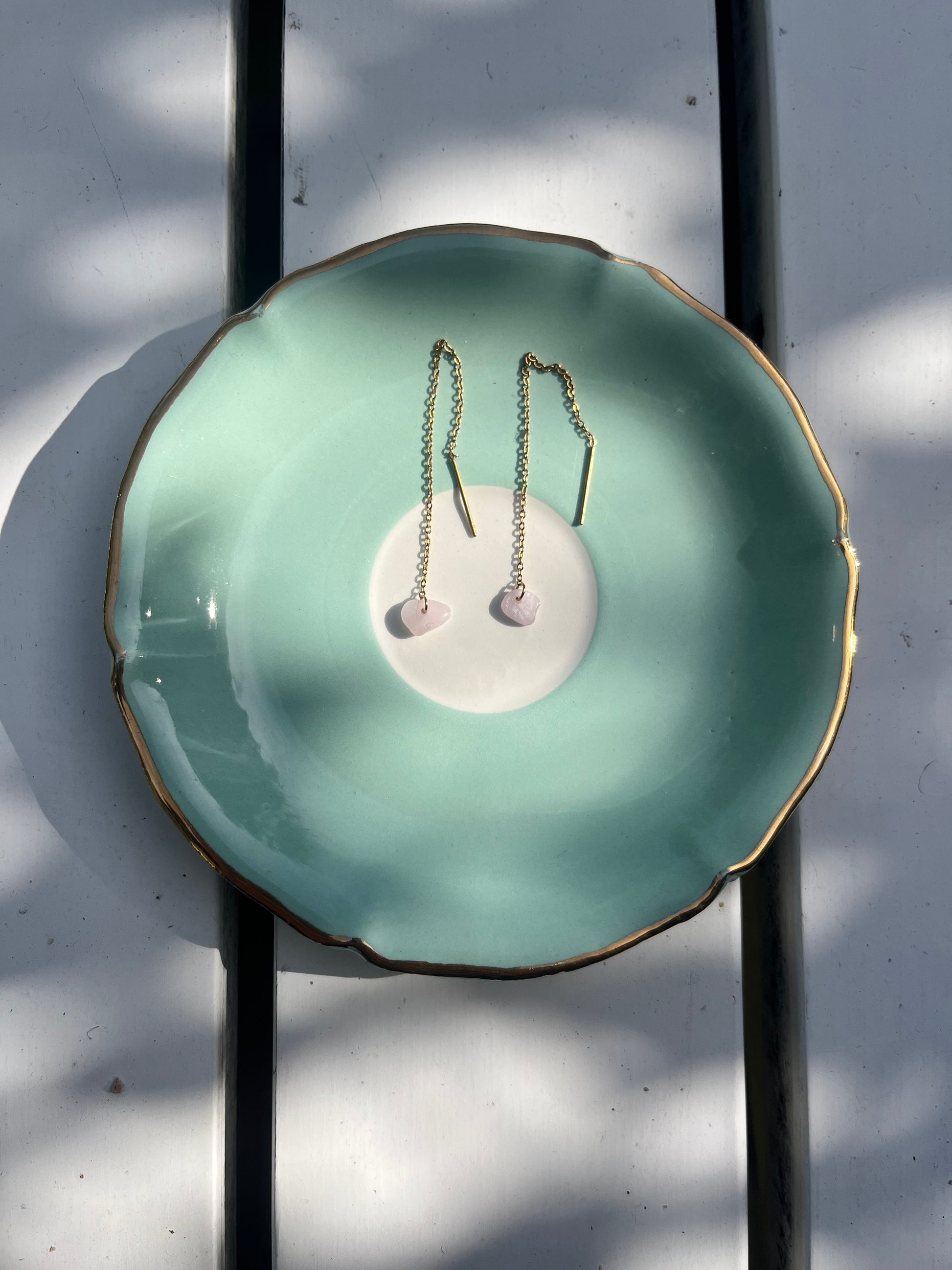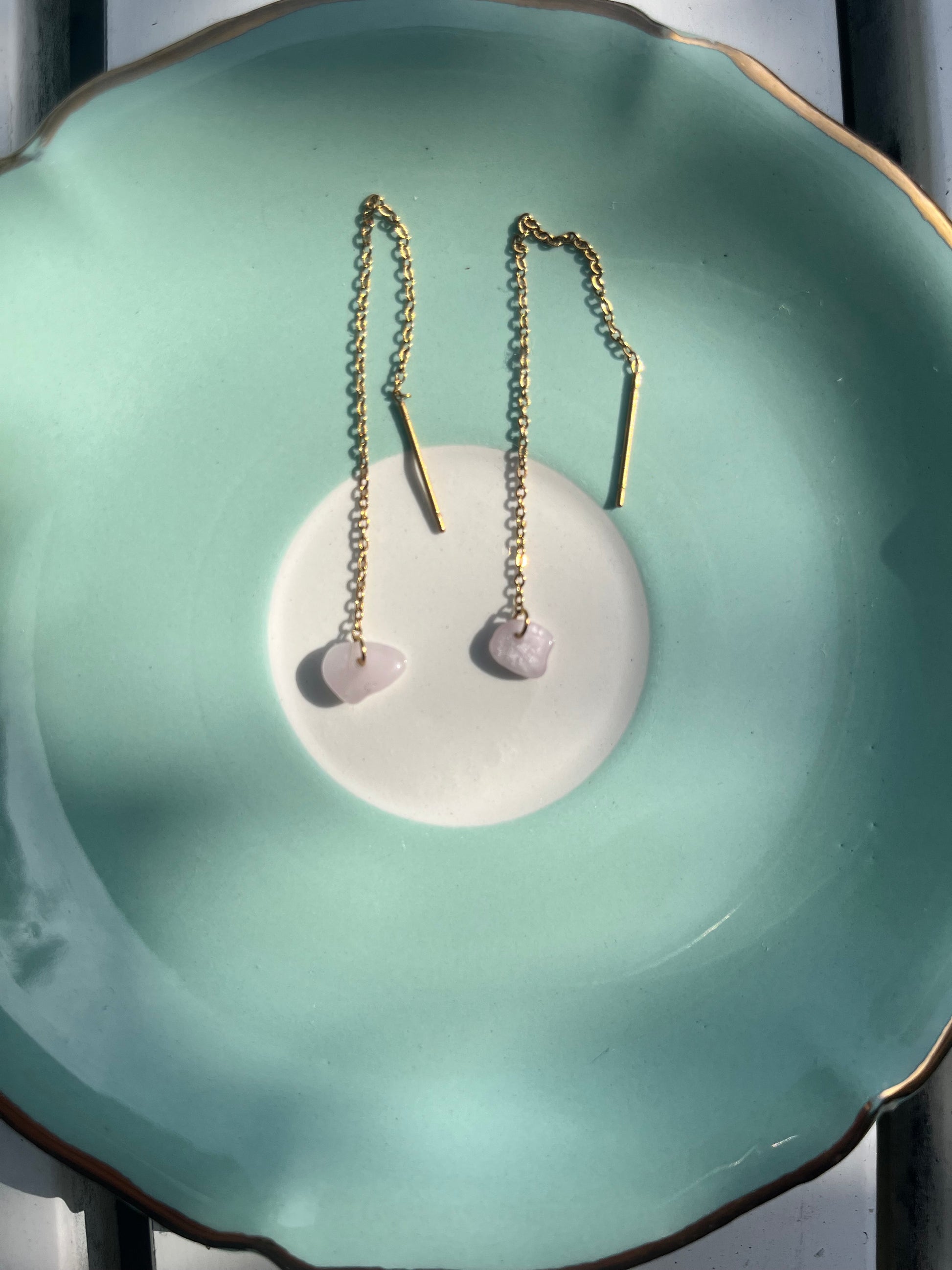 Ces boucles d’oreilles chaînettes en acier inoxydable doré, ornées d’une petite pierre rose naturelle, sont faites main à Toulouse par une créatrice indépendante. Leur design minimaliste et délicat te permet de les porter à travers un ou plusieurs piercings pour un style discret ou audacieux selon ton envie.